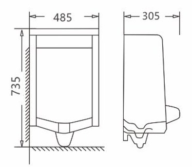 Mingitorio con descarga tipo cascada. No incluye fluxómetro. No incluye sensor, solamente es un sensor decorativo sin funcionamiento. Medidas: 485 x 305 x 735 mms. Material: Ceramica Vitrificada